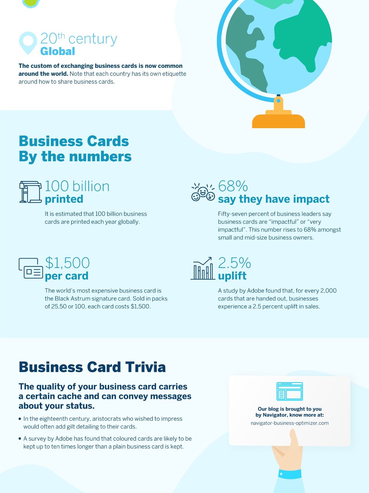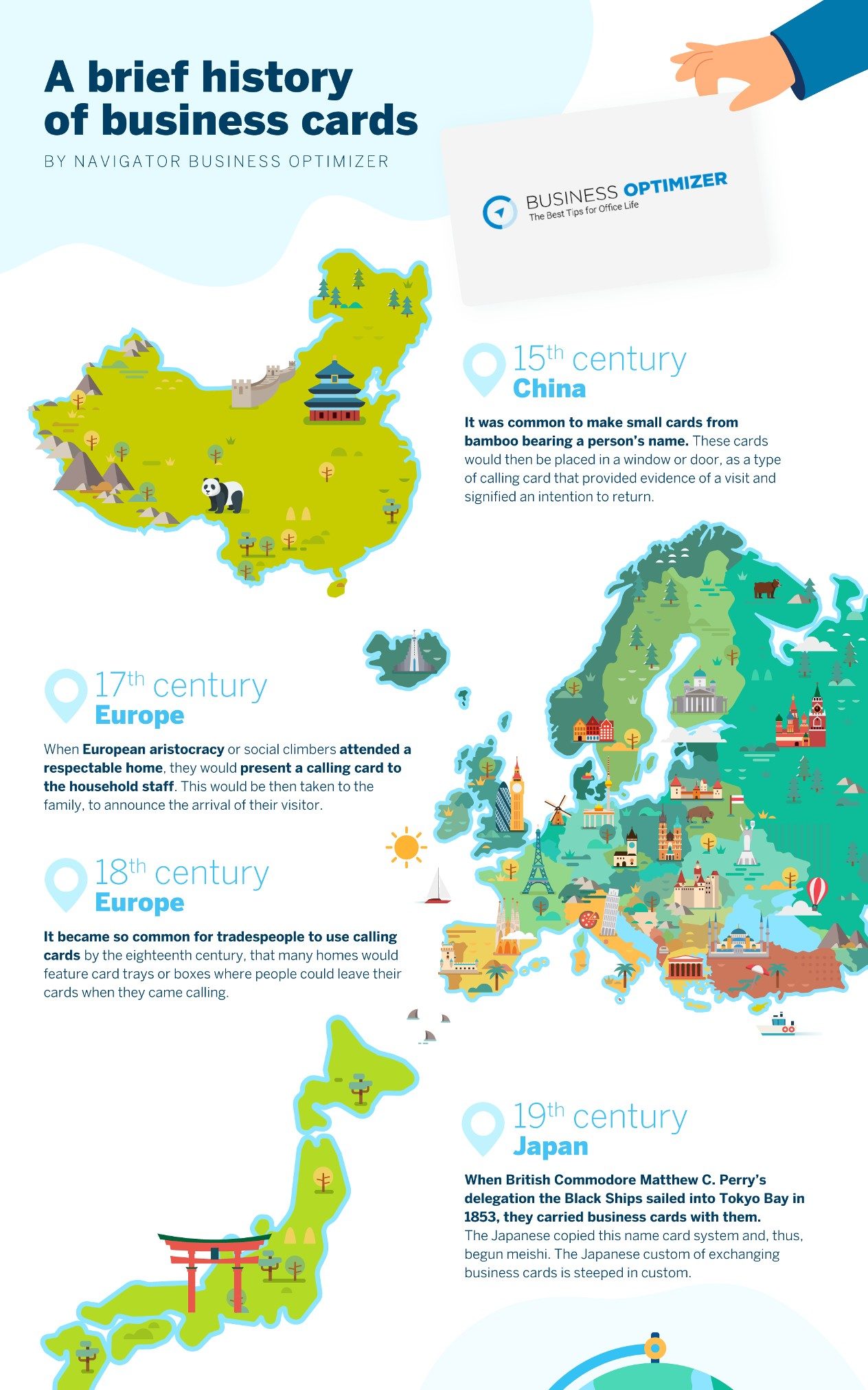 Business cards are rooted in 15th century China, where it was common to make small bamboo cards bearing a person’s name. The tradition then crawled into Europe through 17th century sailors.